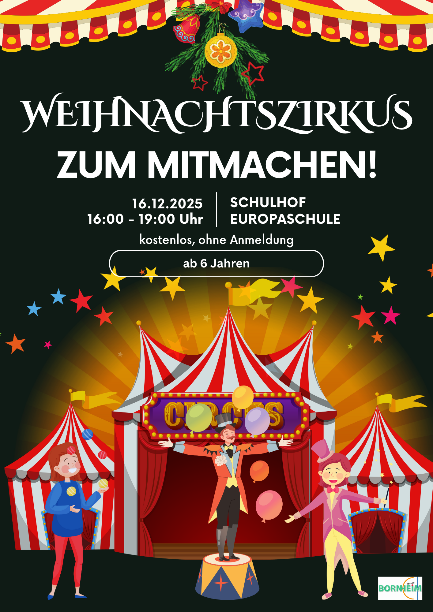 Als Abschluss-Event kommt der Kölner Spielecircus zu uns nach Bornheim! Alle Kinder sind herzlich eingeladen bei der großen Weihnachtsshow mitzumachen. Für leibliches Wohl ist gesorgt: Essen und Getränke gibt es für die Kinder kostenlos. Eine Anmeldung ist nicht erforderlich.