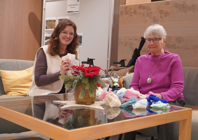 Produzentin der ebenso bunten wie flauschigen Füßlinge und kreativer Geist dahinter ist Helga Wachtel. Die 83-jährige gebürtige Oberpfälzerin lebt seit fünf Jahren im Wohnstift Beethoven. Dort ist sie von Beginn an in der Handarbeitsgruppe und dort unter anderem für Socken zuständig.