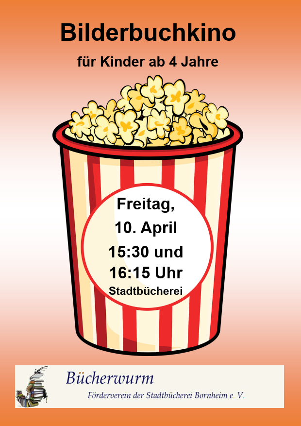 Immer am ersten Freitag im Monat findet das beliebte Bilderbuchkino mit Unterstützung des Fördervereins Bücherwurm statt. Der Förderverein freut sich immer über Unterstützung. Wer zum Beispiel Kuchen backen oder beim Vorlesen unterstützen möchte, meldet sich bei Manuela Wingenbach unter: manuela.wingenbach(at)gmx.de
