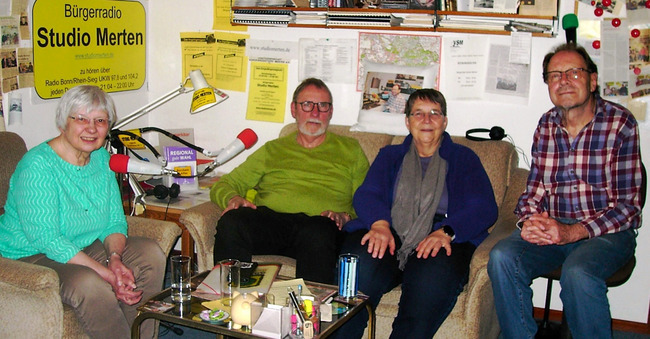 Im Studio sind die Sängerinnen Iris Schürmann-Mock, die in Bornheim lebt und als Autorin arbeitet, sowie Sonja Greiner und Lothar Scheidt im Gespräch mit Otto Ganser, dem Moderator der Sendung. Wie immer ist das Bürgerradio Studio Merten mit dem Vorgebirgsmagazin über Radio Bonn/Rhein-Sieg auf UKW 97,8 und 104,2 sowie auf weiteren Frequenzen zu hören. Aktuelle Infos auch unter: www.studiomerten.de