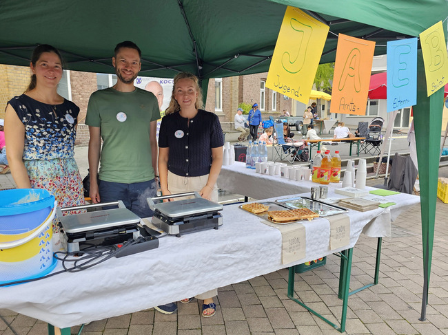 Aus Umzugskartons hatten sie mit den Kindern im Vorfeld „Bausteine der Demokratie“ gestaltet, die nun aufeinandergestapelt wurden und einen wunderbar bunten Turm bildeten. Er war der Mittelpunkt eines schönen Kinderfests, das zahlreiche Familien aus Bornheim und Umgebung anzog. Den Anstoß hatte der Bornheimer Jugendamtselternbeirat (JAEB) gegeben, der an diesem Tag 30 Liter Teig verbackte und unzählige Waffeln sowie Wasser und Apfelschorle verschenkte. Der Obstbaubetrieb Schmitz-Hübsch spendete dazu 200 Äpfel, die ebenfalls großen Anklang fanden.