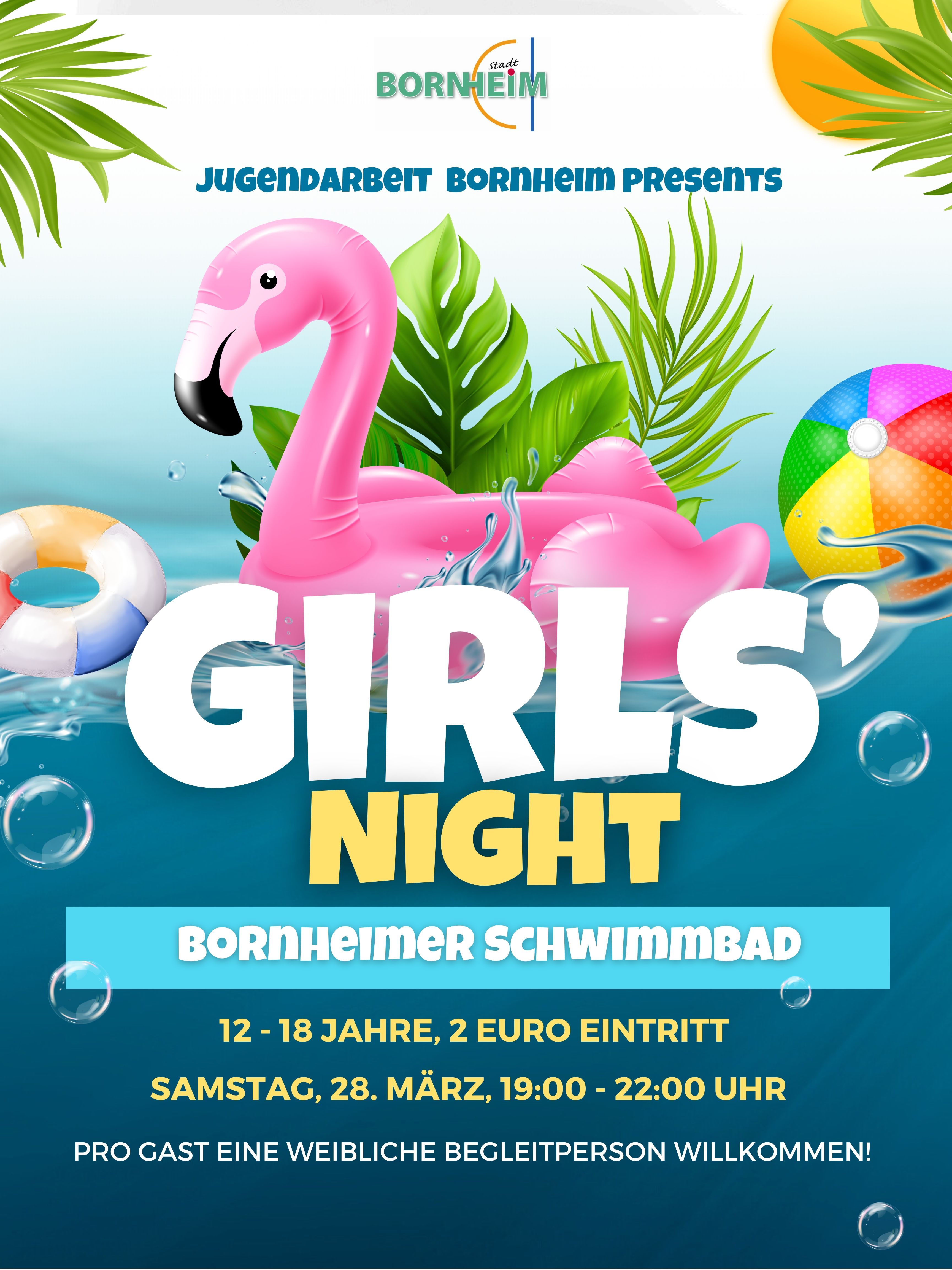 Zur beliebten „Girls´ Night“ im Bornheimer Schwimmbad lädt die städtische Jugendförderung am Samstag, 28. März 2026, ab 19 Uhr ein.