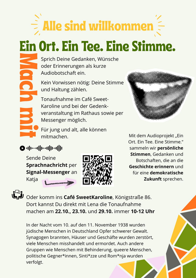 Gefragt sind Gedanken, Gefühle und Botschaften, die uns die Geschichte ins Gedächtnis rufen und für die Demokratie sprechen: Ob persönliche Erinnerung, Reflexion über die Gegenwart oder ein Wunsch für die Zukunft – jede Stimme zählt. Alle Beiträge werden zu einem mosaikartigen Hörstück zusammengestellt und rund um den Gedenktag veröffentlicht. Die Präsentation erfolgt über die städtischen Kanäle wie Instagram und die Website. Teilnehmen kann jeder, unabhängig von Alter, Herkunft oder sprachlichem Hintergrund.