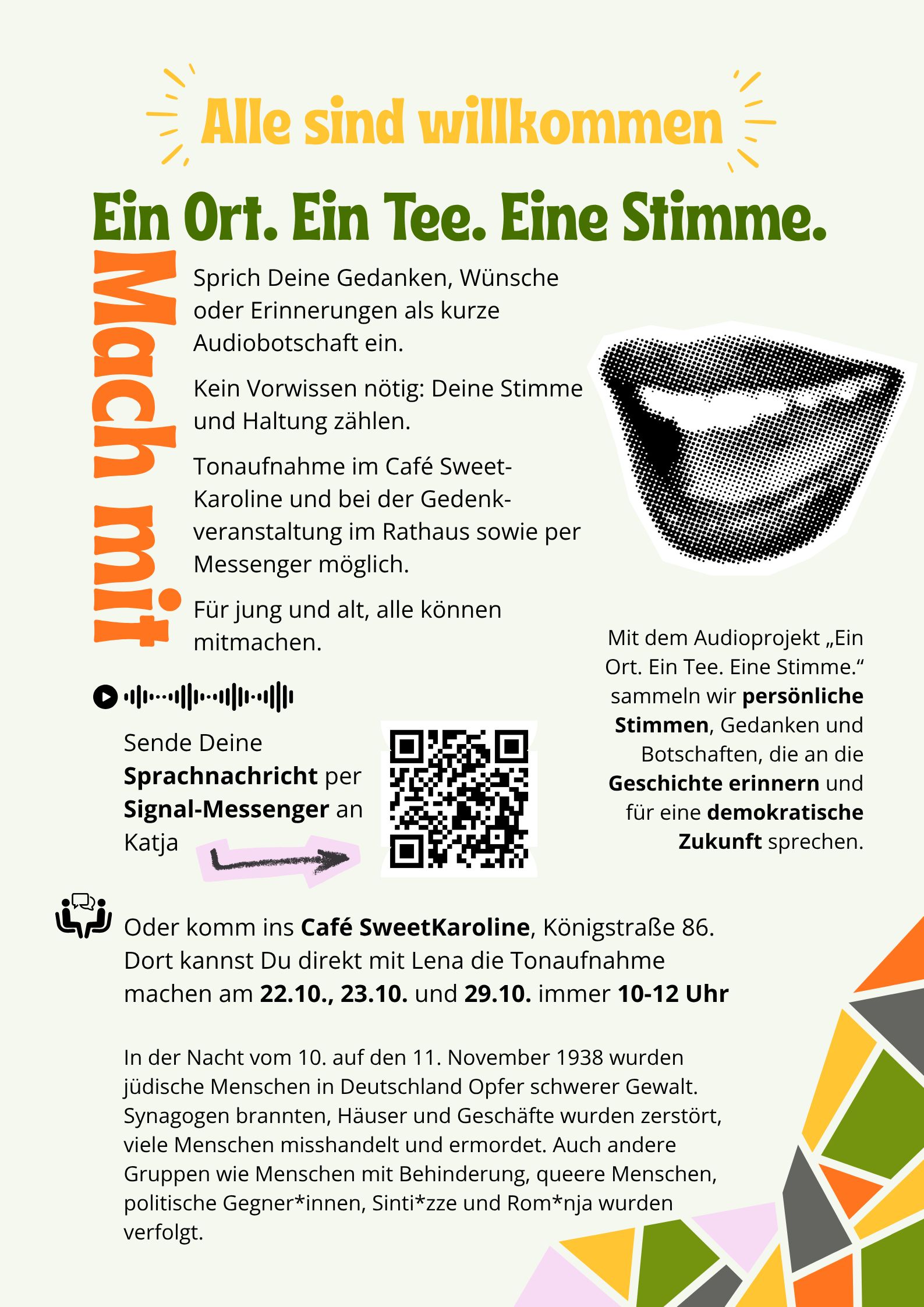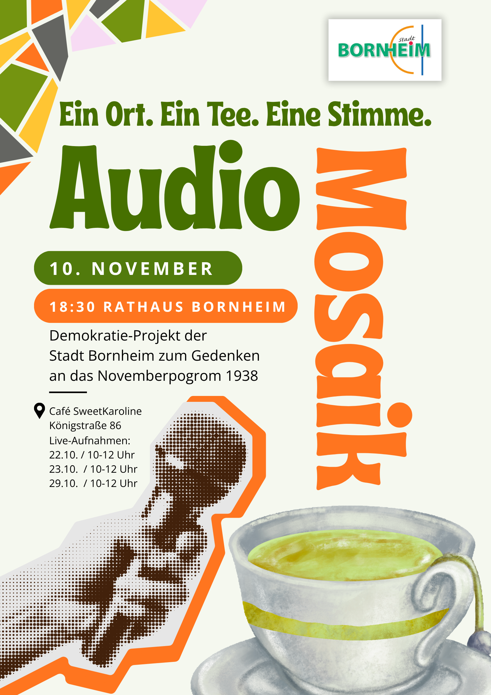 Mit dem künstlerischen Audioprojekt „Ein Platz. Ein Tee. Eine Stimme.“ begleitet die Stadt Bornheim in diesem Jahr ihr Gedenken an das Novemberpogrom und lädt alle Bürgerinnen und Bürger zum Mitmachen ein.