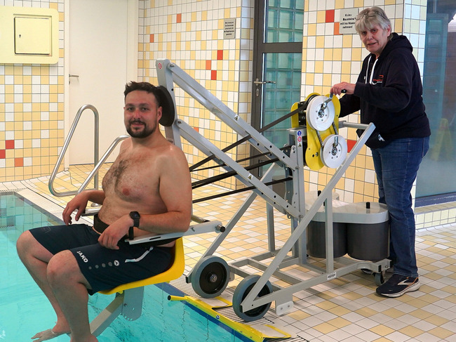 Menschen mit körperlicher Beeinträchtigung können im Hallenfreizeitbad Bornheim nun auf Hilfsmittel zurückgreifen, die ihnen den Einstieg ins Wasser erleichtern.