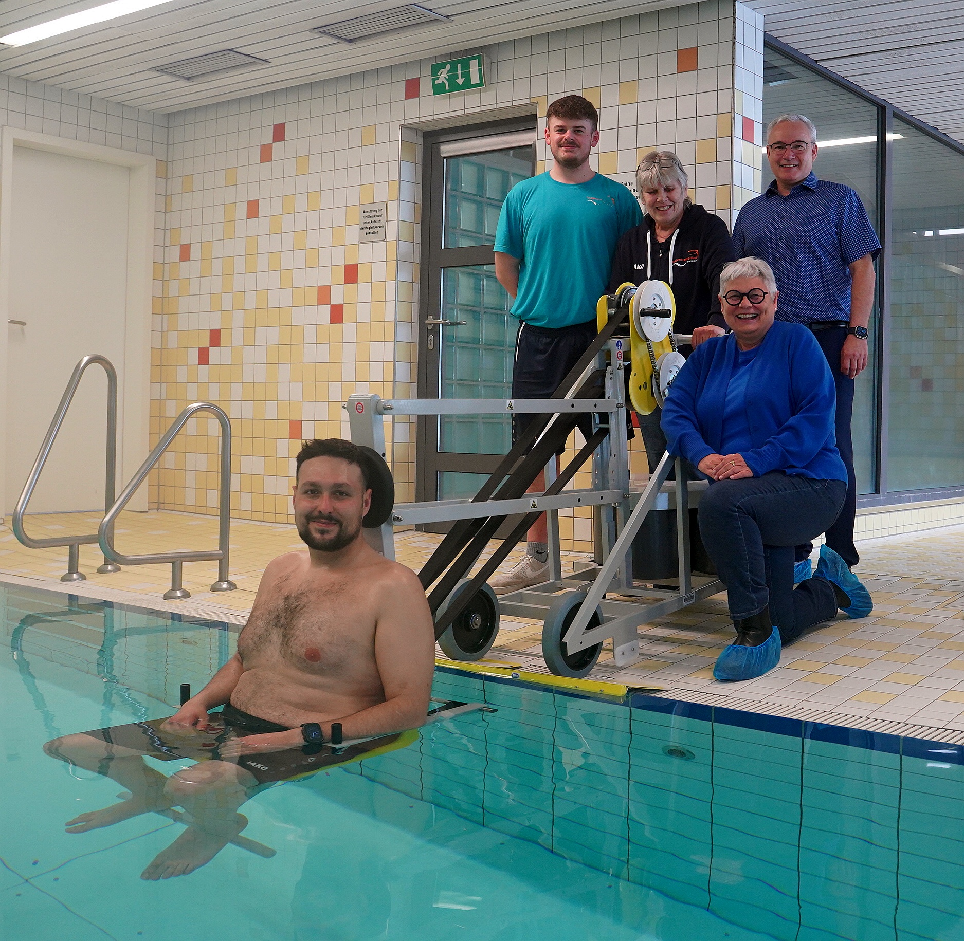 Der Lifter kostete rund 7.700 Euro, der Duschstuhl knapp 1.500 Euro, der Rollator lag sogar bei unter 100 Euro. „Man kann die Geräte ohne Anmeldung nutzen“, erklärte Badleiterin Jüßen. „Sie stehen jederzeit bereit und wir helfen gerne.“ Auch die Auszubildenden Delzerdest Aziz und Leon Schmitz zeigten sich erfreut und erklärten den Kollegen gleich, wie das neue Gerät zu bedienen ist.