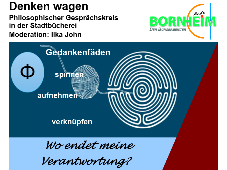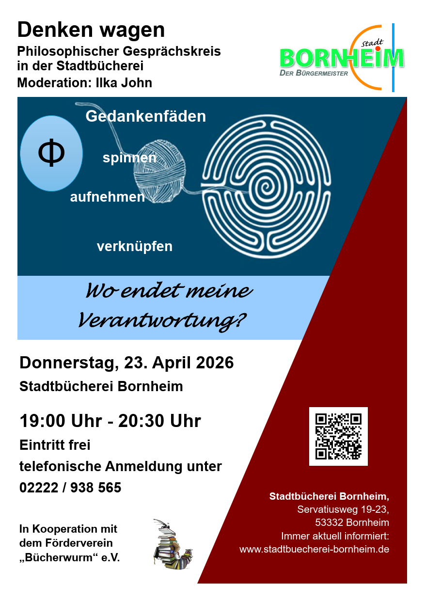 Am 23. April 2026 um 19 Uhr geht es um die Frage „Wo endet meine Verantwortung? “. Der Eintritt ist frei. Aufgrund begrenzter Plätze ist eine Anmeldung erforderlich, telefonisch unter 02222 938-565 oder per Mail an: stadtbuecherei(at)stadt-bornheim.de.