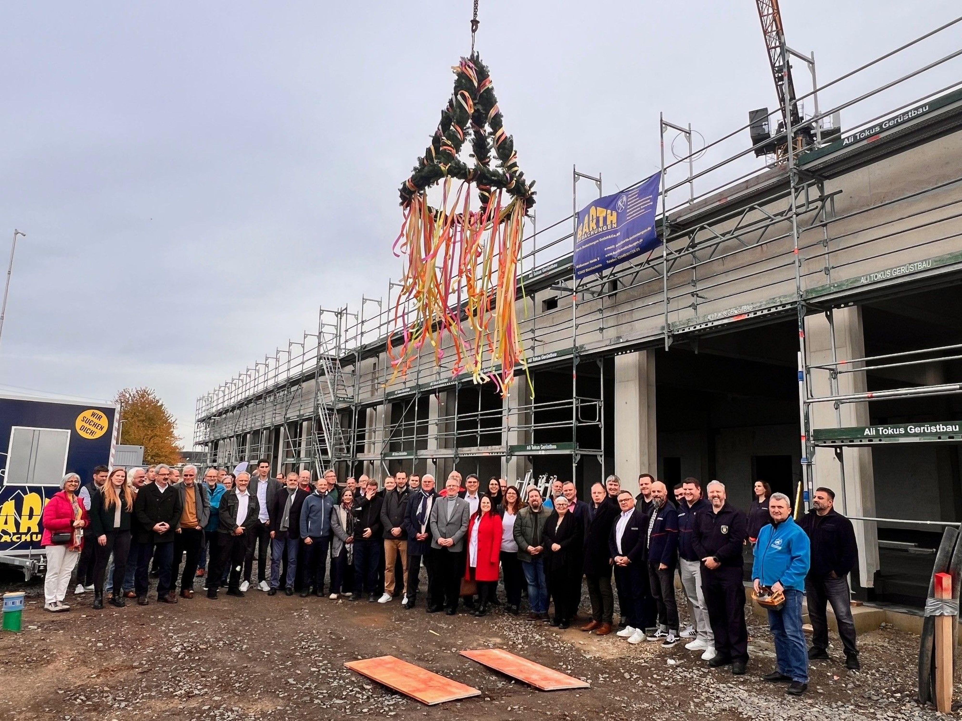 „Hoch lebe dieses stolze Haus, Glück, Heil und Segen geh’n daraus! Hoch! Hoch! Hoch!“, rief Zimmerer Martin Schnorrenberg und erhob sein Glas. Der symbolträchtige Richtkranz krönte das traditionelle Fest, an dem Landrat Sebastian Schuster, Kreisdirektorin Svenja Udelhoven, Michael Rudersdorf, Dezernent für Bevölkerungsschutz, Christoph Becker, Bürgermeister von Bornheim, Vertreter*innen des Malteser Hilfsdienstes, Bauunternehmen und Gäste aus der Politik teilnahmen.