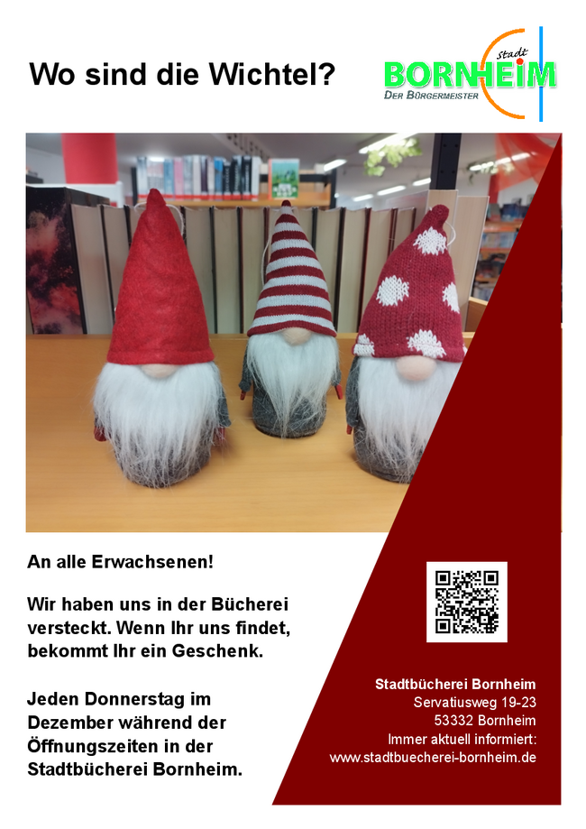 An jedem Donnerstag im Dezember haben sich drei Weihnachtswichtel in den Räumen der Stadtbücherei versteckt. Wer sie findet, kann sie an der Theke gegen ein Geschenk eintauschen.