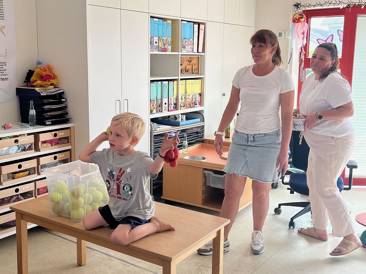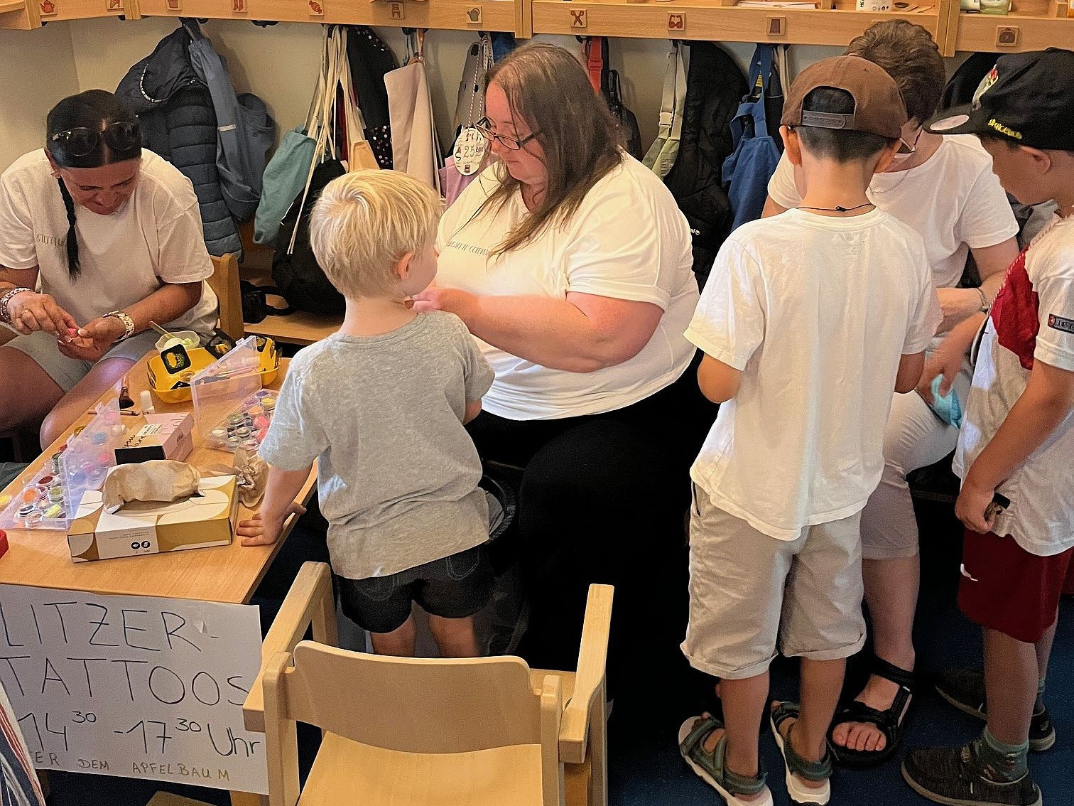 Nach dem offiziellen Teil konnten die Kids dann endlich die vielen Spielstationen stürmen, die sicherheitshalber flugs nach innen verlegt worden waren. Auf zwei Etagen gab es Glitzertattoos, eine Schatzsuche, Bällewerfen und Filzen.
