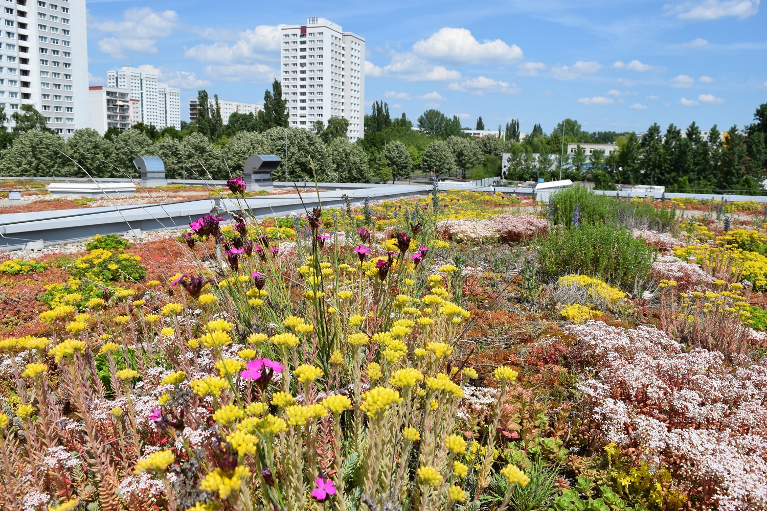 Gebäudegrün ist eine wichtige naturbasierte Maßnahme im Rahmen der Klimaanpassung – also der Anpassung an die Folgen des Klimawandels zur Reduktion von Risiken. Die Pflanzen haben nicht nur eine Dämmfunktion (Hitze, Kälte, Schall), sondern sorgen durch Transpiration auch für aktive Kühlung im Sommer. Zudem halten sie Niederschlagswasser deutlich zurück und reduzieren so die Überflutungsrisiken bei Starkregenereignissen, filtern Schadstoffe aus der Luft, tragen zum Klimaschutz bei, unterstützen die Biodiversität und fördern die psychische Gesundheit durch naturnahe Elemente. Je mehr Gebäudegrün desto größer wird der so genannten Schwammstadteffekt.