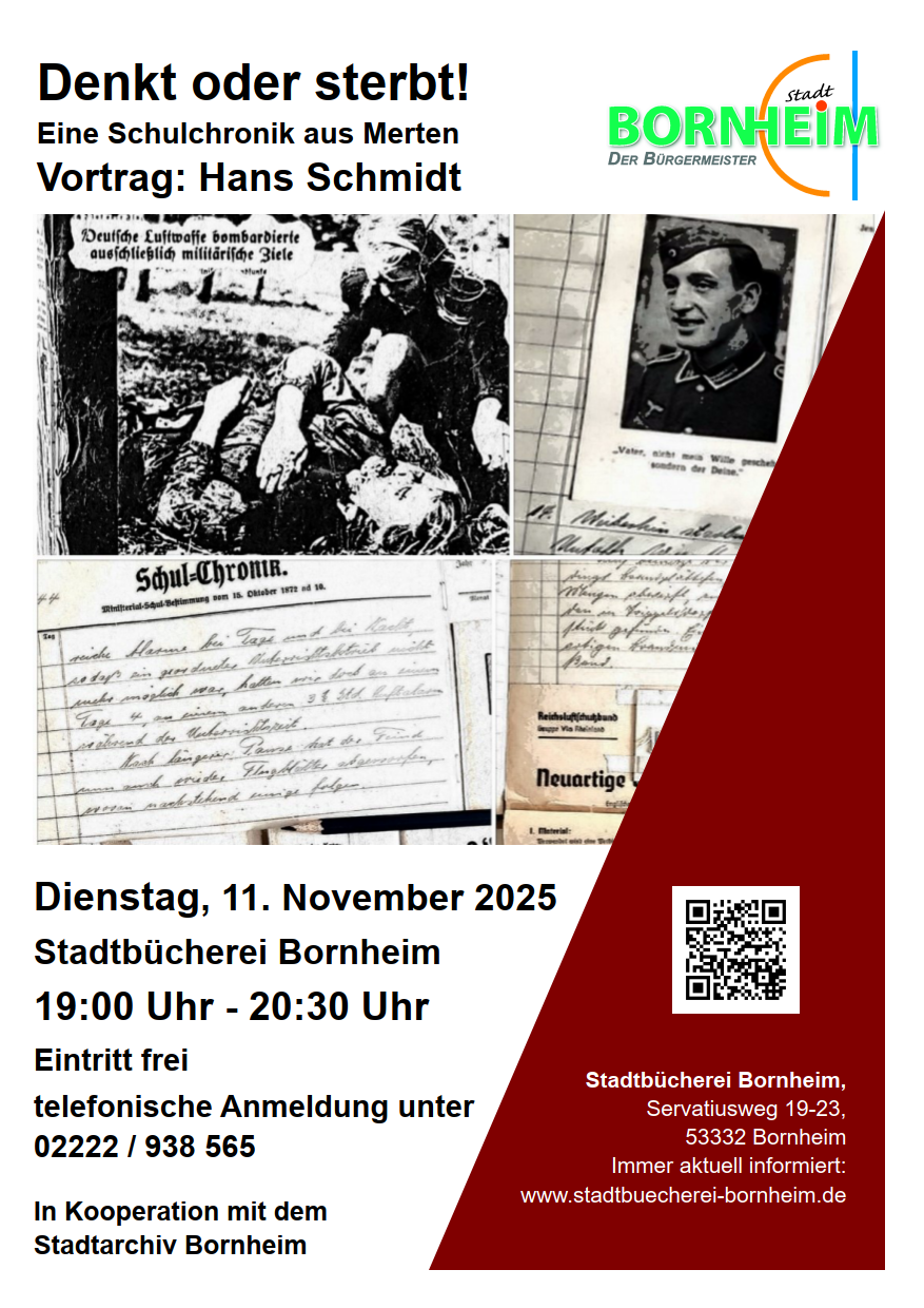 Am 11. November 2025 präsentiert der Kunsthistoriker Hans Schmidt um 19:00 Uhr in der Stadtbücherei Bornheim die Mertener Schulchronik aus den Jahren 1940 bis 1949 - eine makabre und bedrückende Collage aus einer Zeit, die sich niemals wiederholen darf. Die Indoktrination der Schülerinnen und Schüler durch parteitreue Lehrer, die menschenverachtende Ideologie des Nationalsozialismus und der Wahnsinn des Krieges; all das spiegelt sich in dieser Quelle in besonderem Maße. Totenzettel ehemaliger Schülerinnen und Schüler finden sich neben dem Bericht einer Schulfeier, bei der die Mertener Jugend auf den Heldentod eingeschworen wird.