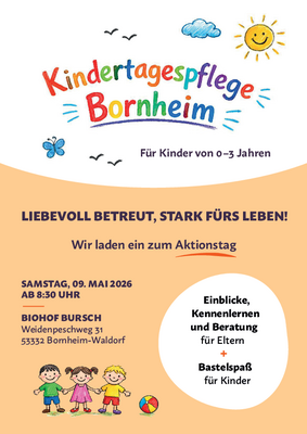 AnfahrtBornheim beteiligt sich an der bundesweiten Aktionswoche „Gut betreut in Kindertagespflege" des Bundesverbands mit einem eigenen Aktionstag. Die Veranstaltung auf dem Biohof Bursch (Weidenpeschweg 31 in Waldorf) lädt Familien ein, die Kindertagespflege hautnah erleben.