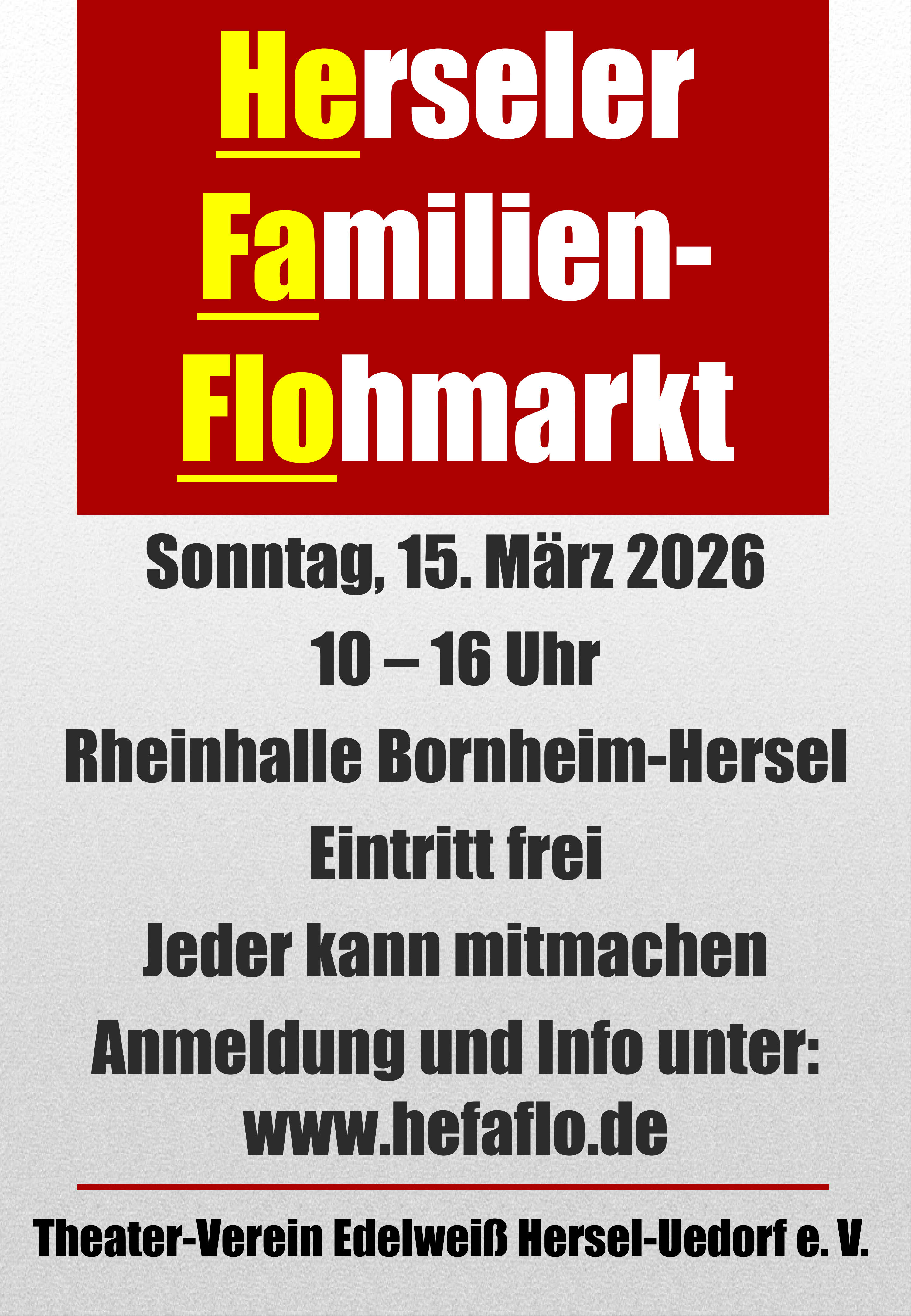 Wir veranstalten wieder unseren beliebten Herseler-Familien-Flohmarkt in der Rheinhalle. Es erwarten euch ca. 120 Meter Verkaufsstände mit einem großen und vielfältigen Angebot. Geöffnet ist auch wieder unser beliebtes He-Fa-Flo-Bistro mit Frühstück, Currywurst und Pommes sowie Waffeln und Getränken. In der Halle und daher überdacht! Kommt vorbei.