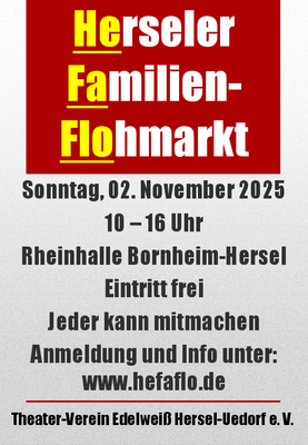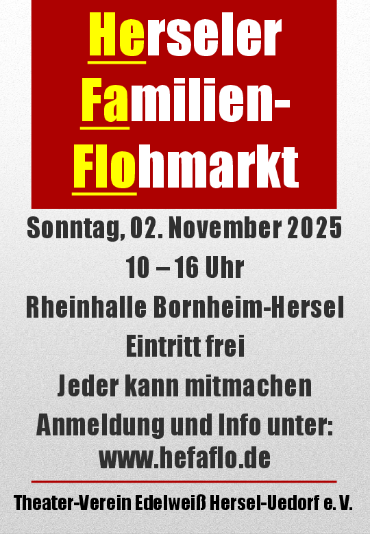 Zum achtzehnten Mal veranstaltet der Theater-Verein Edelweiß Hersel-Uedorf e. V. den großen Herseler-Familien-Flohmarkt (HeFaFlo) am Sonntag, 02. November 2025 in der Rheinhalle Hersel (Rheinstraße 201). Verkaufsbeginn ist um 10 Uhr, Verkaufsende gegen 16 Uhr. Der Eintritt ist frei. Es stehen kostenfreie Parkplätze zur Verfügung. Für Snacks und Getränke ist gesorgt. Unsere Verkäufer sorgen mit über 120 Metern Verkaufsständen für ein abwechslungsreiches Angebot. Das legendäre HeFaFlo-Bistro mit Currywurst/Pommes, Frühstück und Waffeln ist auch wieder geöffnet. Infos unter www.hefaflo.de. Jeder kann zum Stöbern vorbeikommen. Es gibt immer Schnäppchen zu ergattern. Wir freuen uns auf zahlreiche Besucher:innen.