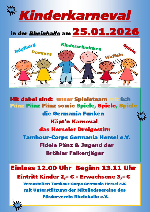 AnfahrtAm Sonntag, den 25.01.2026 findet in der Rheinhalle Hersel wieder der Kinderkarneval statt. Einlass ist um 12.00 Uhr, Beginn um 13.11 Uhr. Das Tambour-Corps Germania Hersel und die Mitgliedsvereine des Förderverein Rheinhalle e.V. freuen sich über alle kostümierten Pänz, die den Weg in die Rheinhalle finden. Es erwartet Euch ein tolles Programm. Hüpfburg, Spiele, Kinderschminken sowie die Auftritte der Germania Funken, Käpt'n Karneval, Tambour-Corps Germania Hersel, Fidele Pänz & Jugend der Bröhler Falkenjäger und natürlich das Herseler Dreigestirn. Zur Stärkung und Erfrischung gibt es Waffeln, Pommes usw. sowie allerlei Getränke. Eintritt für Erwachsene 3,00 Euro und für Kinder 2,00 Euro. Karten gibt es nur an der Tageskasse.