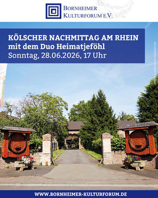 AnfahrtDas Bornheimer Kulturforum lädt für Sonntag, den 28. Juni 2026, 17 Uhr, einmal mehr zur kölschen Musik am Rhein in den Marienhof, die historische Hofanlage der Weinkellerei Antwerpen, Bornheim-Hersel, Rheinstraße 218 ein.