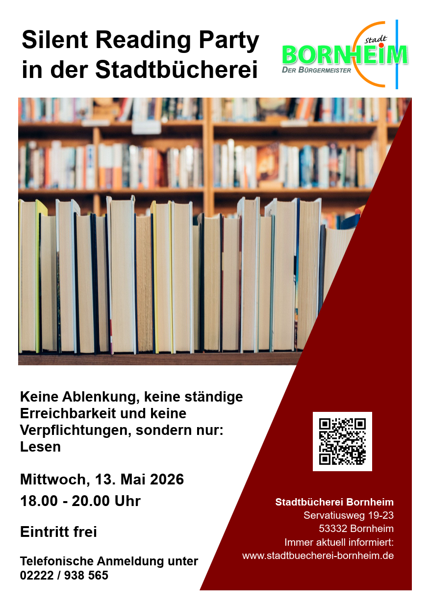 Wegen der begrenzten Teilnehmerzahl ist eine vorherige Anmeldung erforderlich, entweder telefonisch unter 02222/938565 oder per Mail an stadtbuecherei@stadt-bornheim.de.