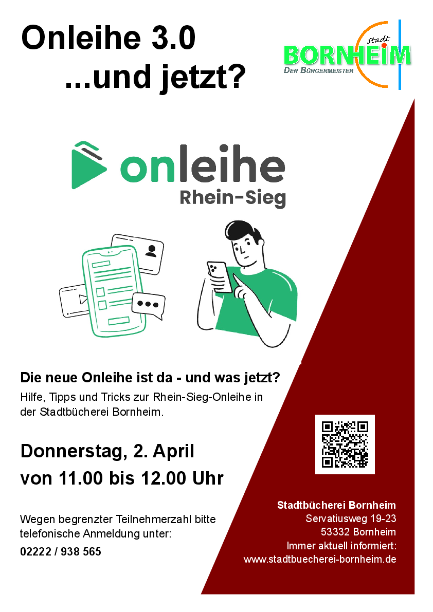 Der nächste Termin ist am Donnerstag, 2. April, 11 bis 12 Uhr in der Stadtbücherei Bornheim, Servatiusweg 19-23. Die Stadtbücherei bittet um vorherige Anmeldung, telefonisch unter 02222 938-565 oder persönlich während der Öffnungszeiten.