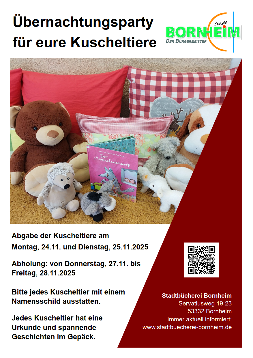 Gebt Eure geliebten Plüschkameraden von Montag, dem 24. November bis Dienstag, dem 25. November in der Stadtbücherei ab und Eure Kuscheltiere haben am Mittwoch die Stadtbücherei ganz für sich alleine und erleben spannende Abenteuer.